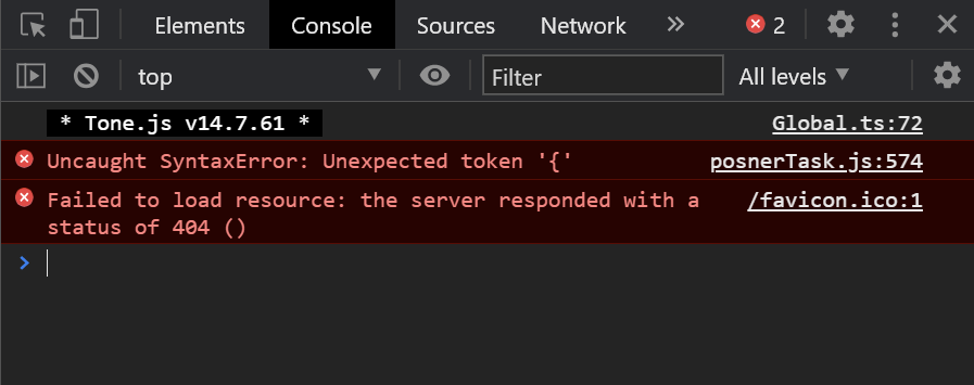 Big errors are in red like the above picture and these are probably whats causing you problem. As you can see in this error, its an uncaught SyntaxError: Unexpected Token ‘{’. If you look to the right of that, it handily tells you it is in the PosnerTask.js file on like 574.