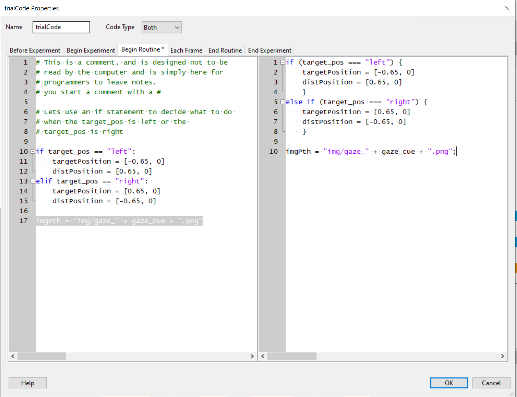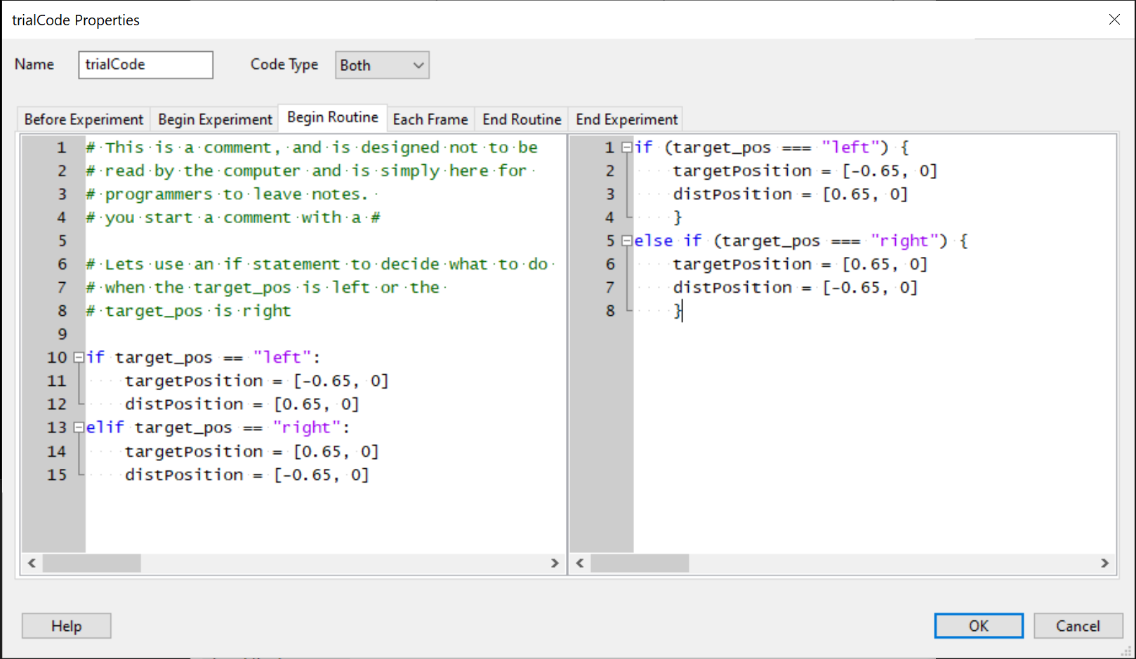 In the begin routine code we are deciding the positioning of the target and distractor using an if statement. Thankfully, JavaScript also supports if statements in a very similar way. Our translation below demonstrates how similar things are: