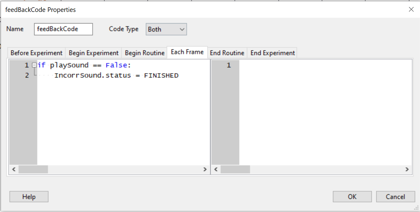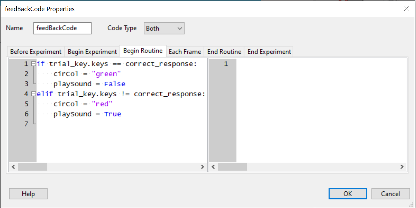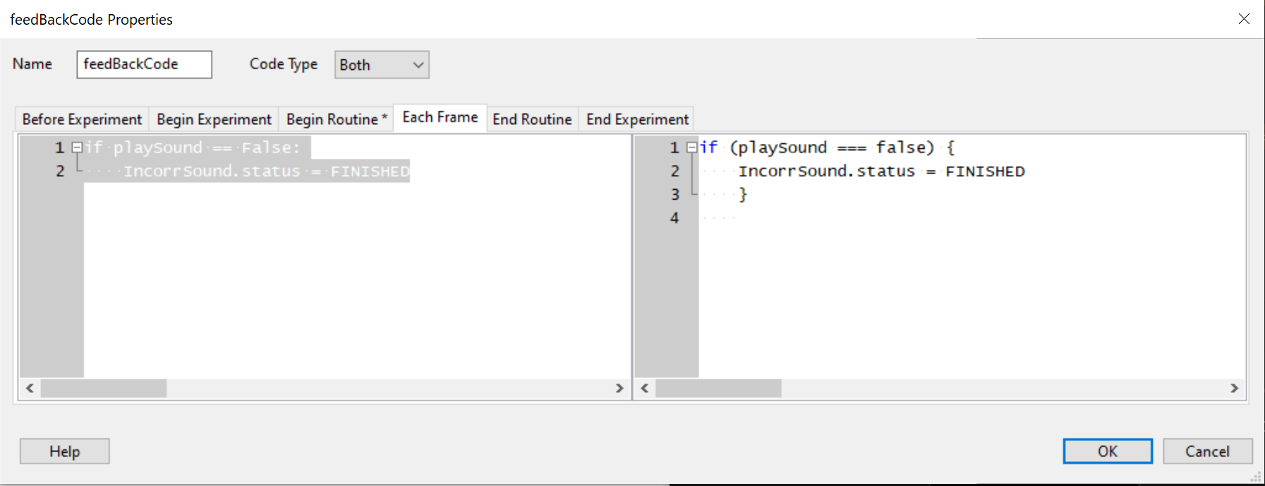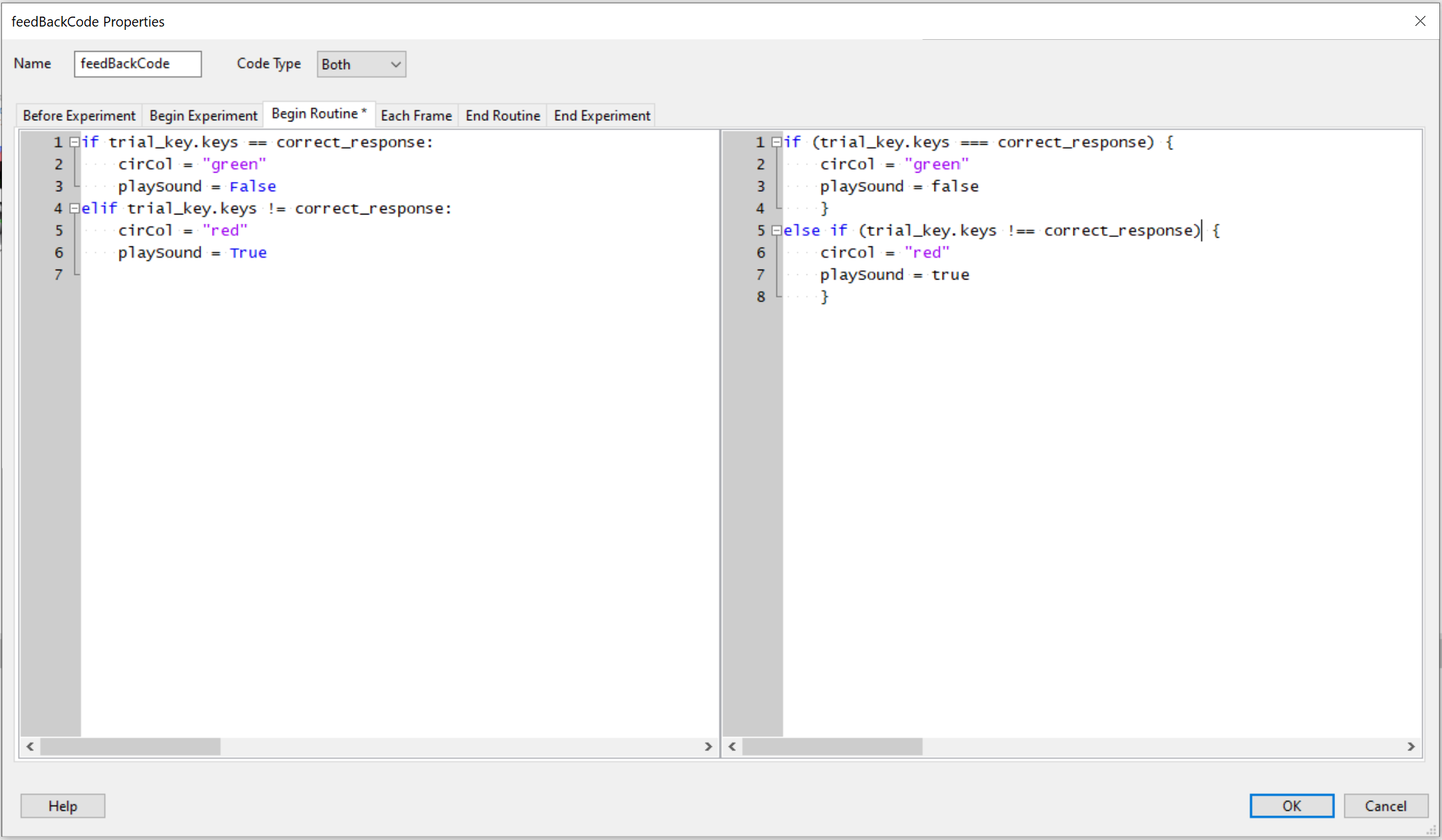 In our feedback routine we have some code that control whether audio is played, and the colour of our circle. This also needs translating. We have both Begin Routine code, as well as Every Frame code to deal with…