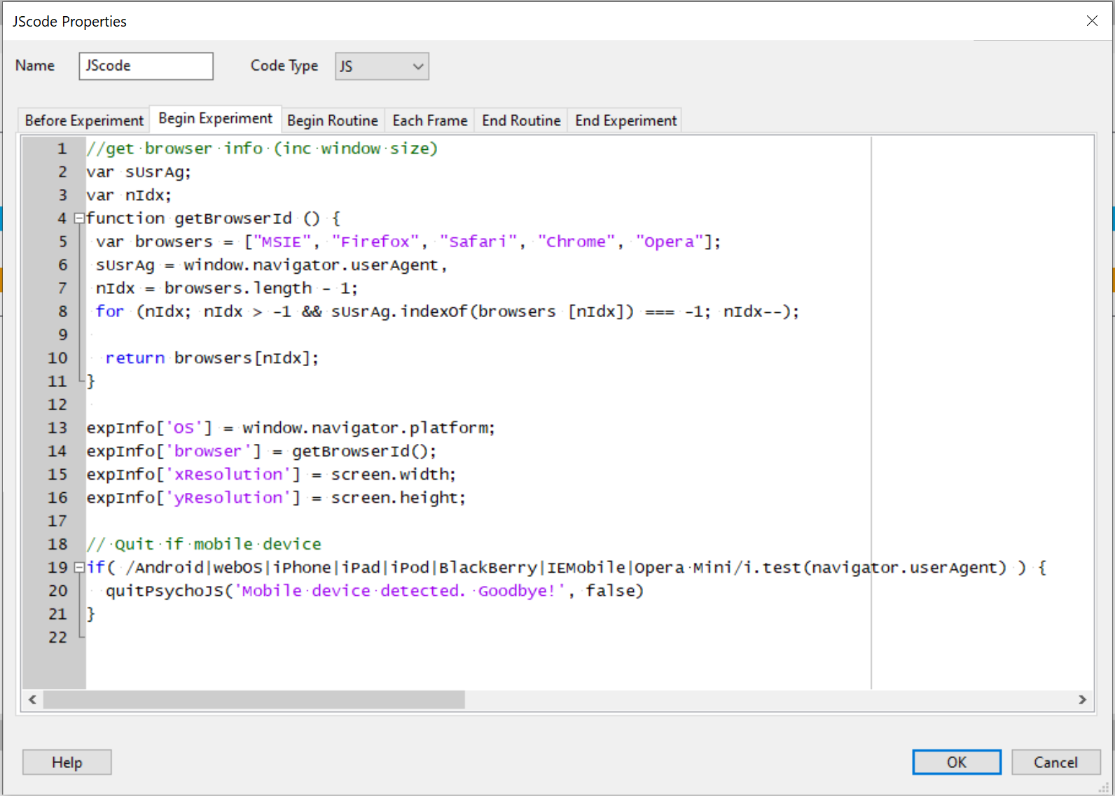 So, the first thing you might notice here is that comments are prefixed with a // and you see a lot more curly brackets { } (called braces) in JavaScript. Basically what this code does is firstly creates whats called a function to figure out what browser you are using. The code below that (starting with expInfo) adds various things to the data file by way of adding it to a hidden data object called expInfo (or in English, Experiment Information), which stores stuff like participant number, the date and time etc. Unlike other custom variables, we dont actually explicitly need to tell PsychoPy to save this information to file, its done automatically. Finally, the bit at the bottom is an if statement that assess what device people are using. If they are using any of the ones listed (e.g., Android) it will quit with a goodbye message quitPsychoJS('Mobile device detected. Goodbye!', false).