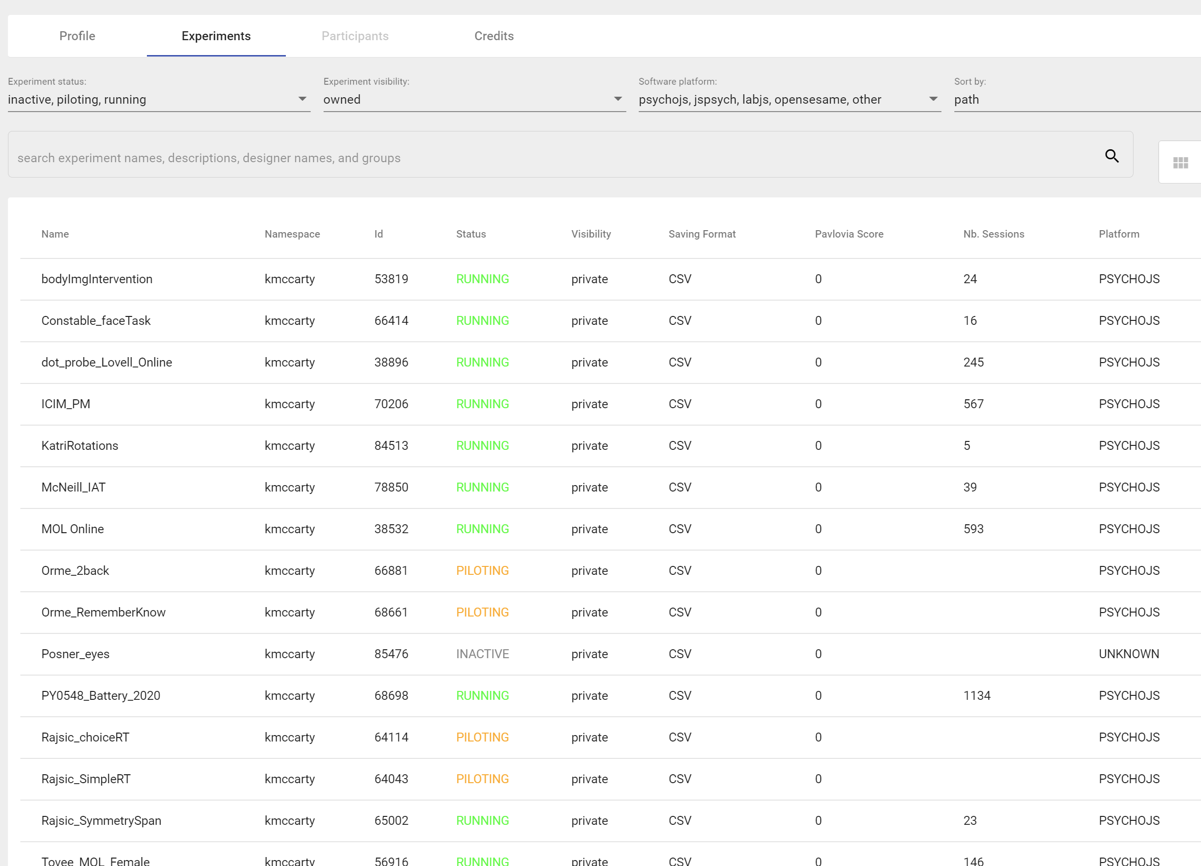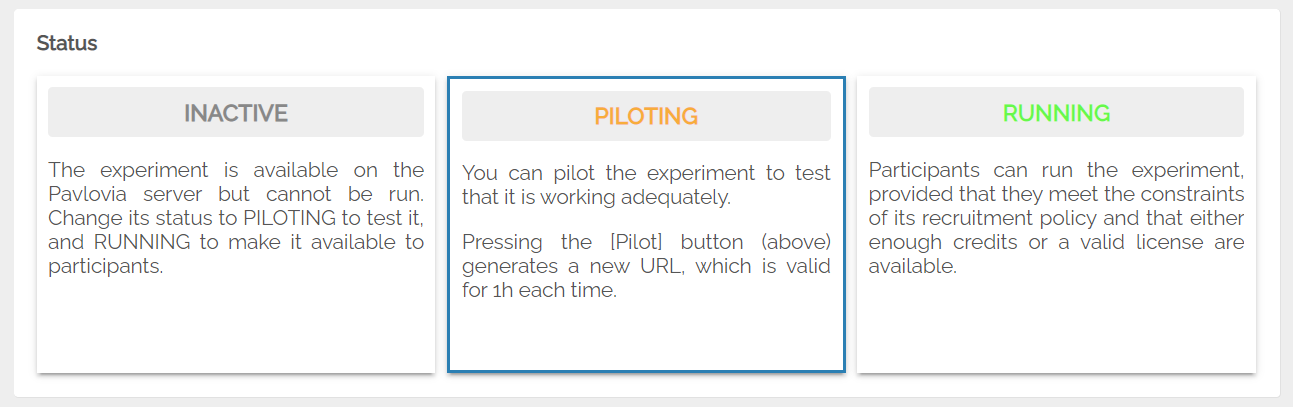 We see here that Inactive means the experiment is on the server but cannot be run. Piloting is where we can pilot the experiment to test if its working. Running is where you et a URL and can collect and save data.