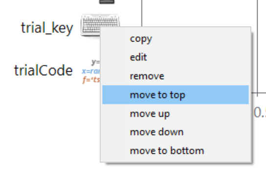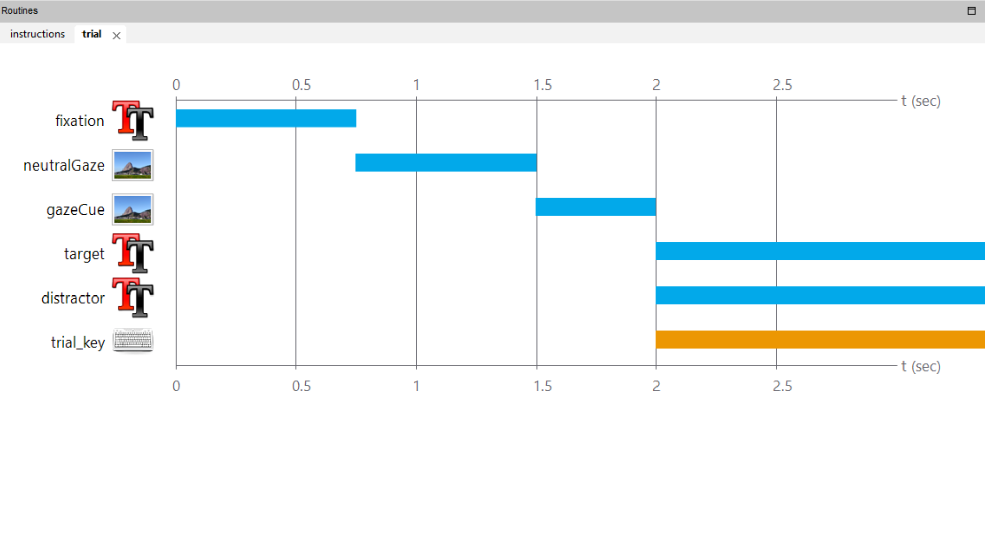 If you are familiar with Opensesame, you will know that a ‘Sequence’ is a combination of objects such as fixation crosses, stimuli, keyboard objects etc. A common sequence would be a trial (e.g. a fixation cross for 500ms followed by a word on the screen, followed by a keyboard response). In PsychoPy, these are known as Routines. We might have a Routine for the introduction, a routine for a trial, a routine for feedback etc.