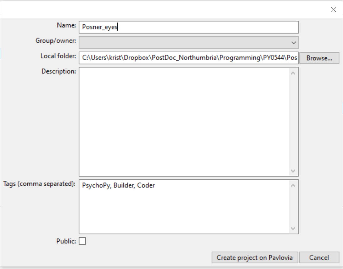 A new window appears asking you to name your project and give it some details. We can skip most of this and just give it a name. I called mine Posner_eyes.