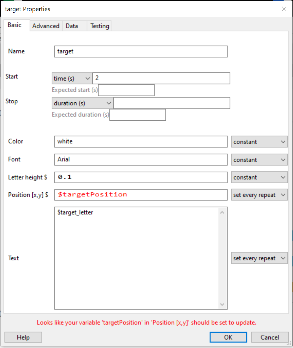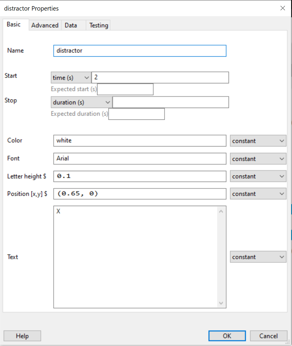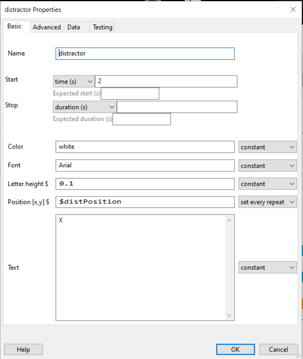 dist_pos - This is where our X (distractor letter) appears. It is the opposite of the target pos, so when the target_pos is left, the dist_pos will be right.