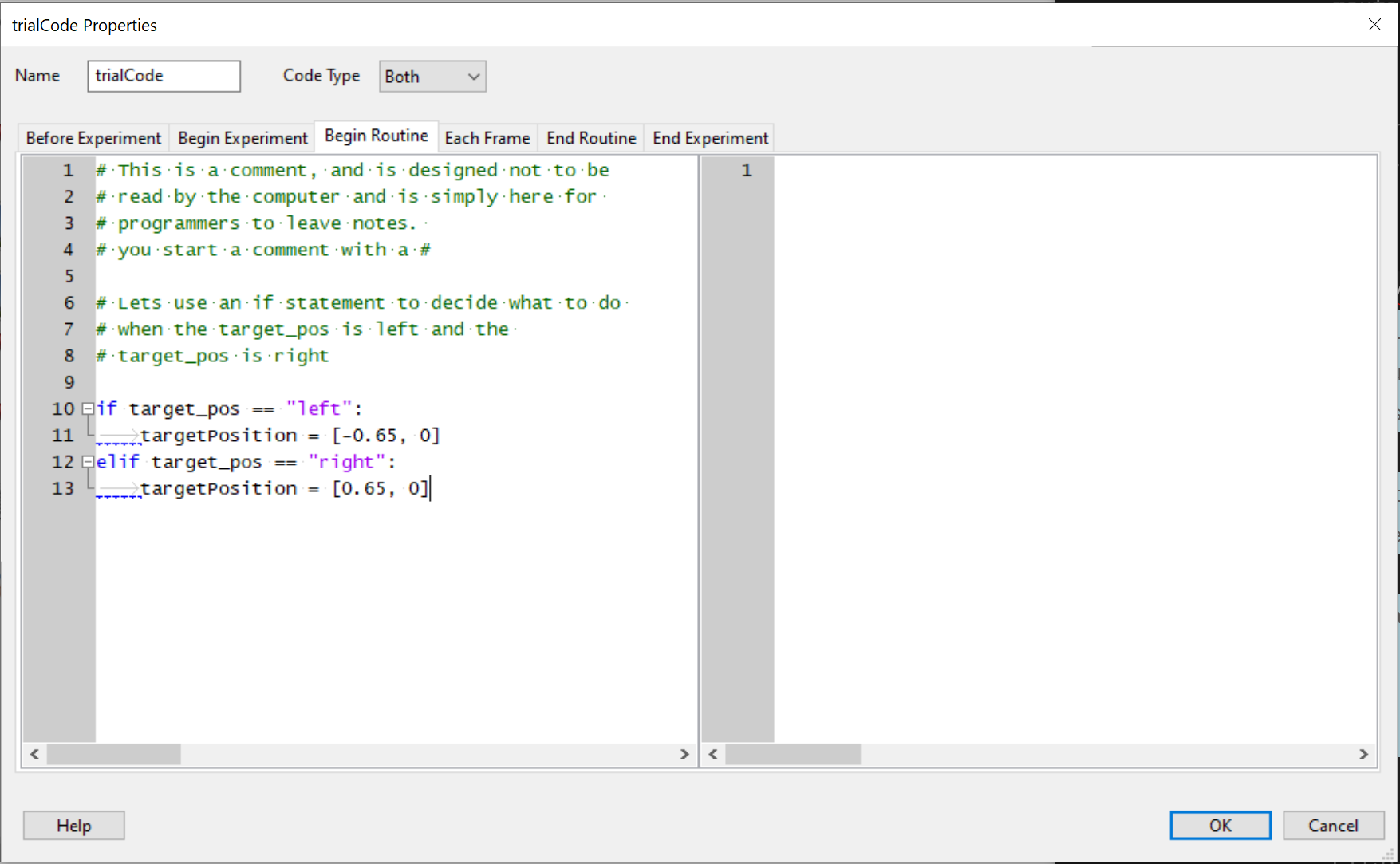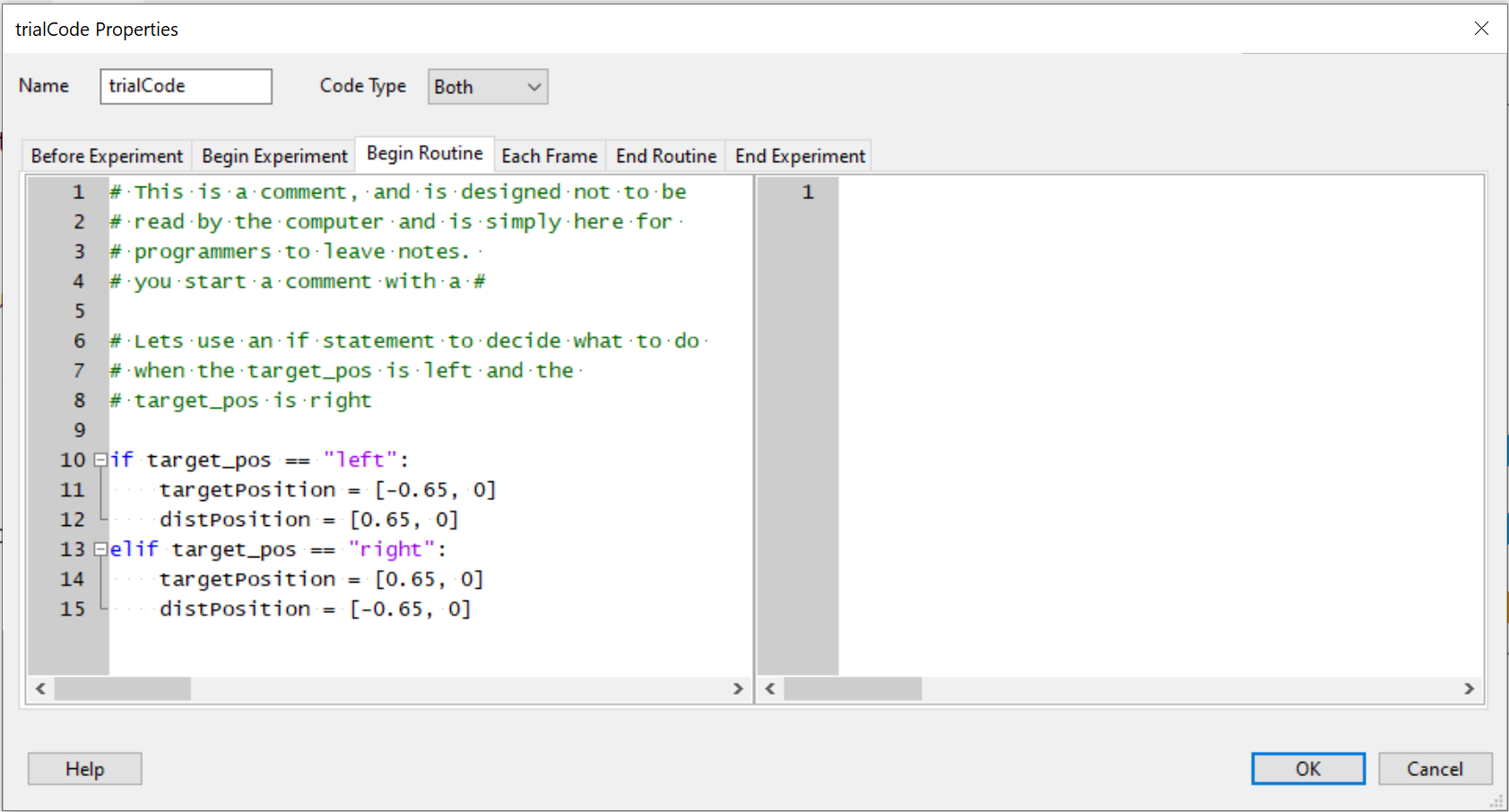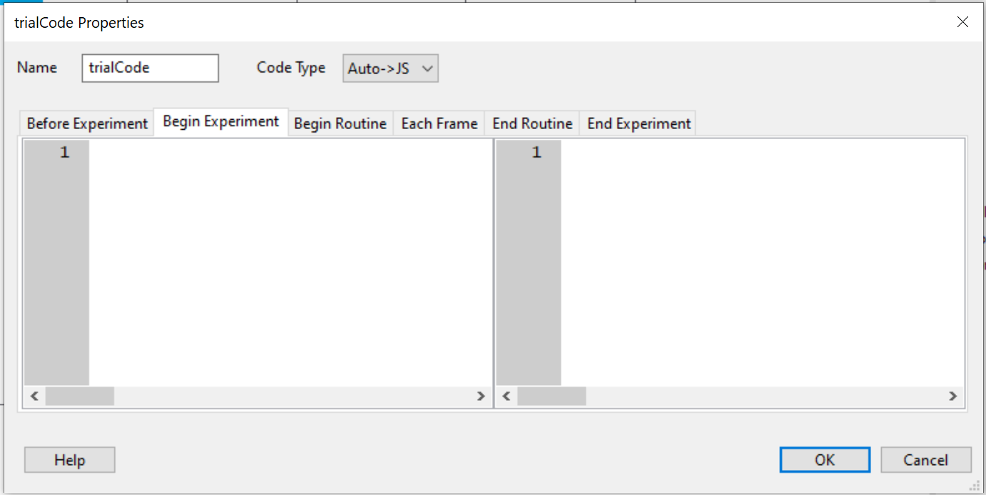 Lets move to our trialCode component in our trial routine. If you remember, we selected code type Both, which allows for independent Python and JavaScript code to be entered.