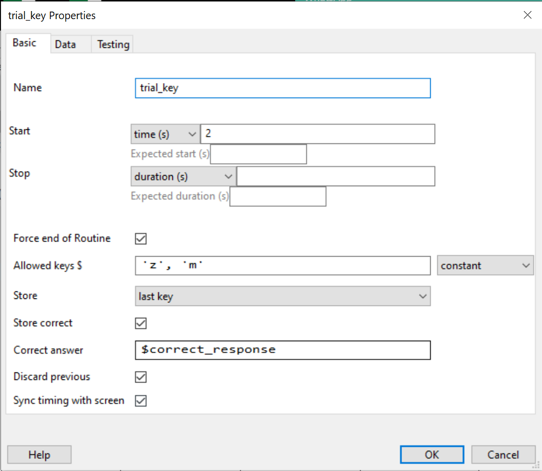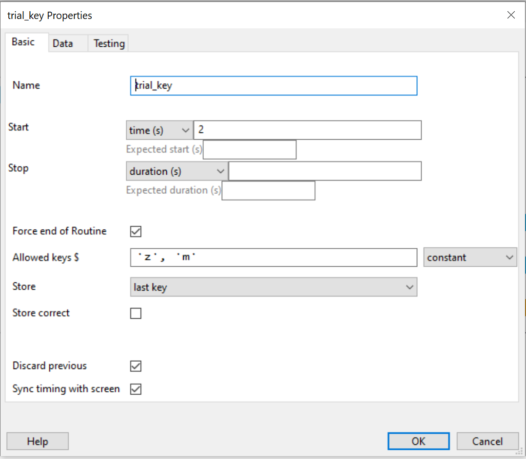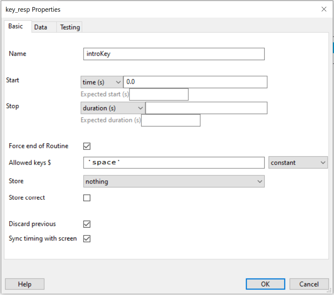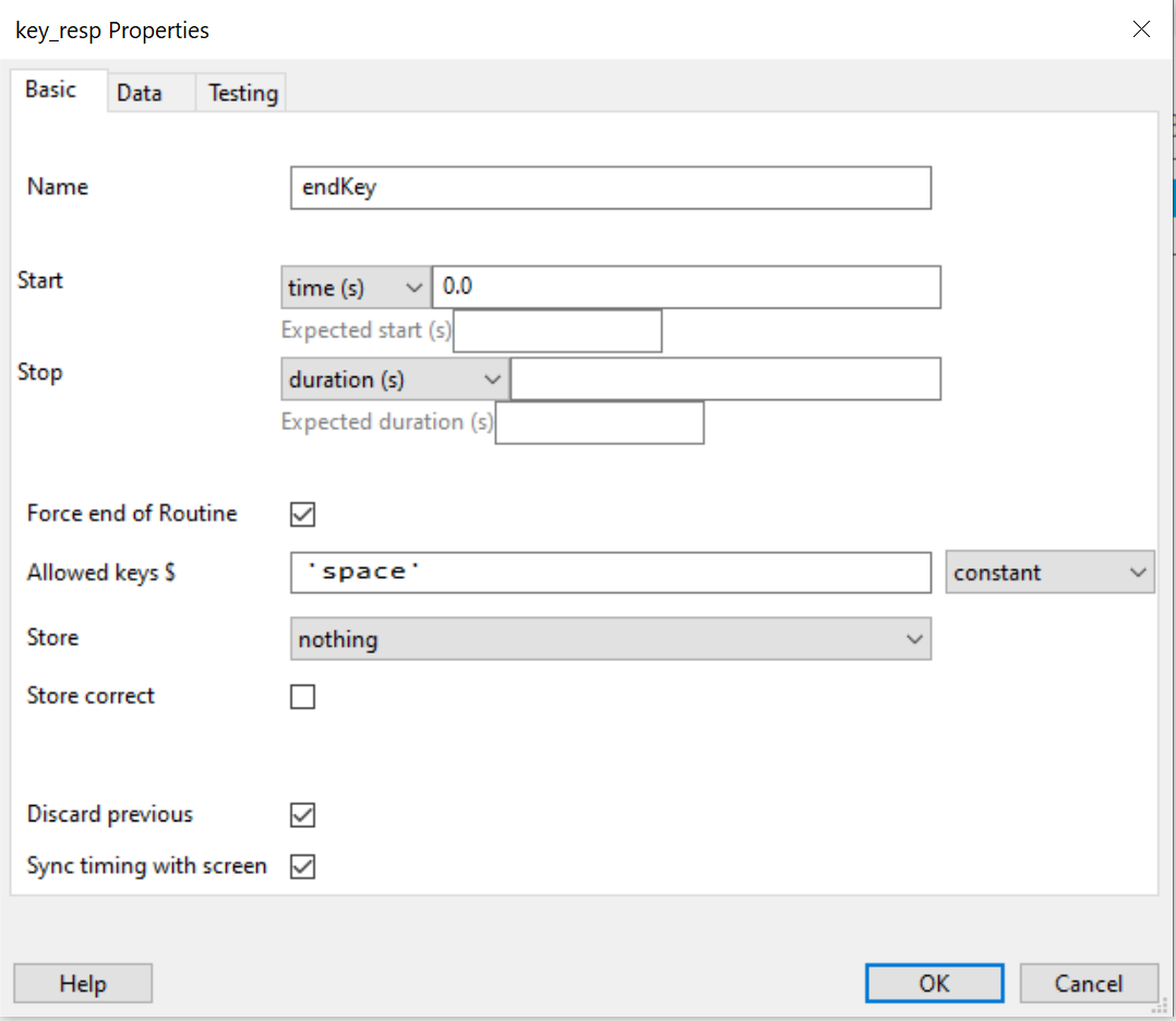 Changed Store from ‘Last Key’ to ‘Nothing’. As this is an arbitrary keypress, we don’t need to store what was pressed or how long it took participants to do so. This helps reduce necessary clutter in our data file.