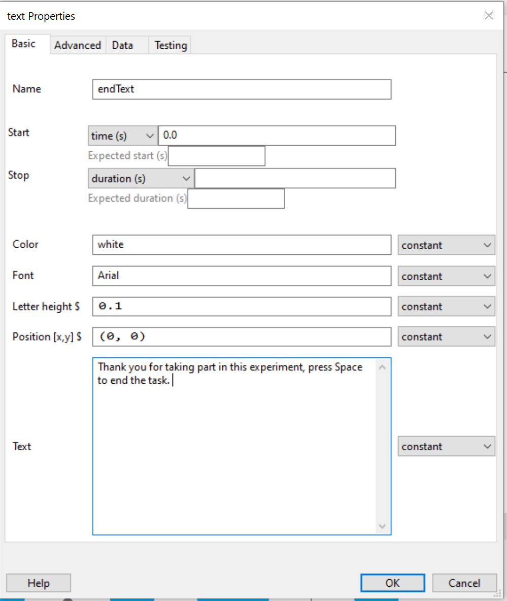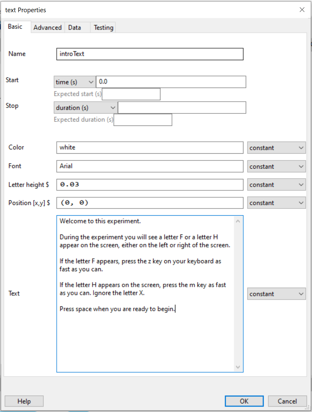 Now, if were to run our experiment it would load and display our text. However, as we didn’t tell the experiment how to end that text display (i.e. listen for a keyboard response), it would be stuck there forever with no way to interact with the experiment!