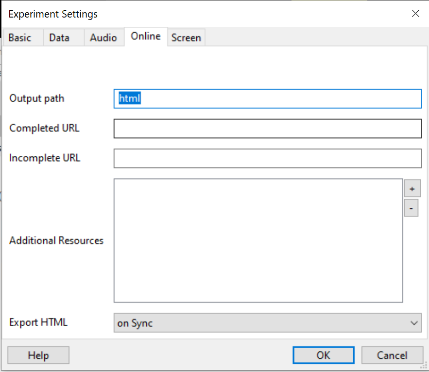 Next tab is Online. There are only two important things here: 1) to ensure here is the Output path is empty. This basically means when you save and export to online format (a combination of HTML and JavaScript), it will save the structure in the root folder, where your .psyexp is. 2) under the additional resources tab, its probably worth clicking the '+' and adding your pictures and sound files. Click OK to save an continue...