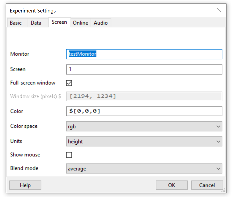 The next field of interest is the Units. We have lots of options, but for online studies with lots of different screen sizes etc., we need to use ‘Height’. This essentially is a relative unit whereby the screen height ranges from 0.5 (top), to 0 (middle), to -0.5 (bottom). The x-axis is calculated relative to this height unit. Read more about units here. don’t worry too much about this yet. We will get to it later. I would leave Full Screen ticked.