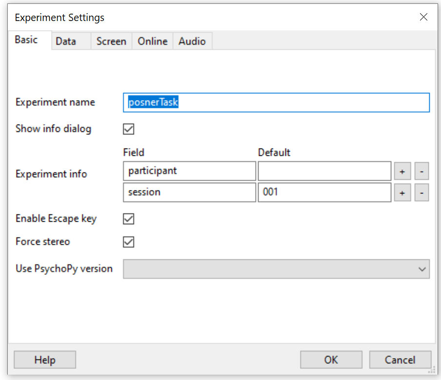 The only thing we need to change in the Basic tab is to remove the ‘Session’ experiment information as all of our participants do the same task. To do this, simply click the minus (-) button next to it.