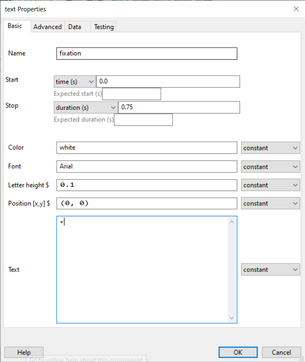 NB: If you deleted the trial routine, create a new routine after the introduction by following the instructions in the introduction routine above.To keep things simple, lets make our fixation cross a simple + in the centre of the screen. We will use a text object for this