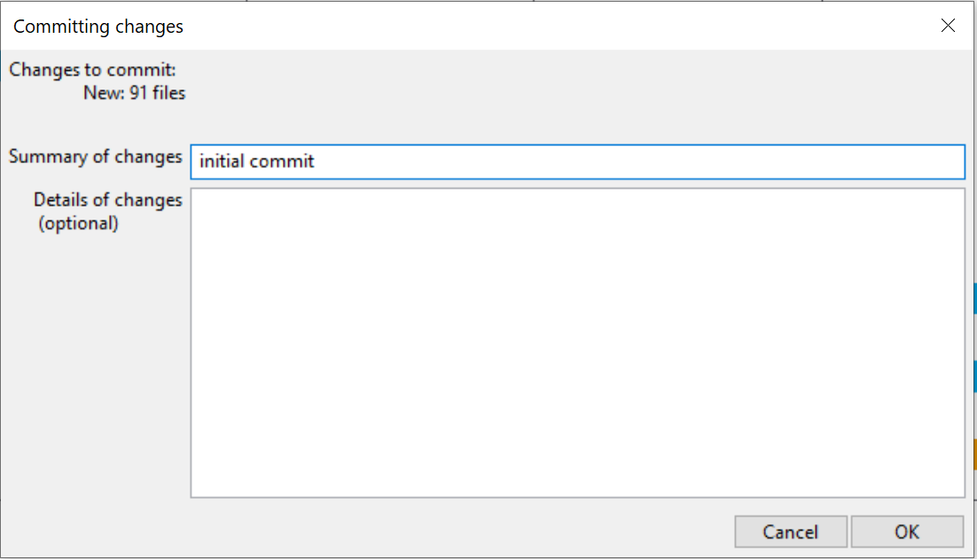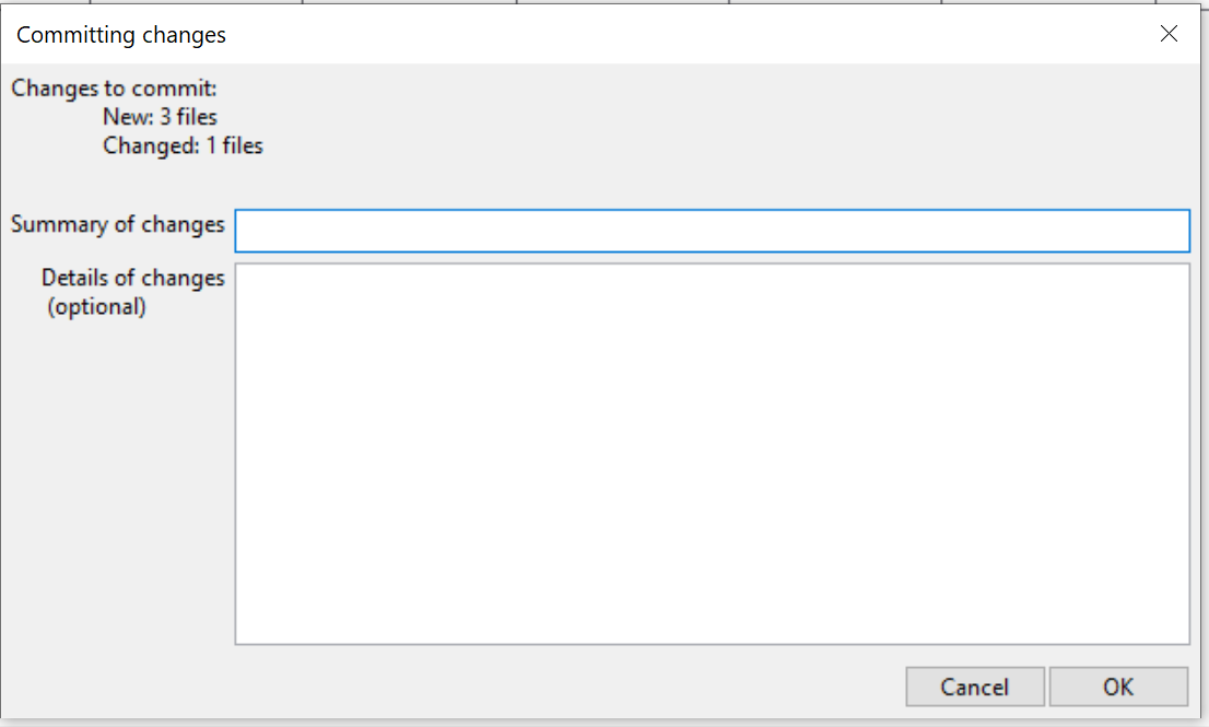 A third window appears asking you to provide some details on your ‘Commit’. This term simply means commit changes, or ‘save’ changes'. think of this a little like when you save a document with the same name and it asks whether you want to replace that file. in the Summary of changes, I have just written initial commit