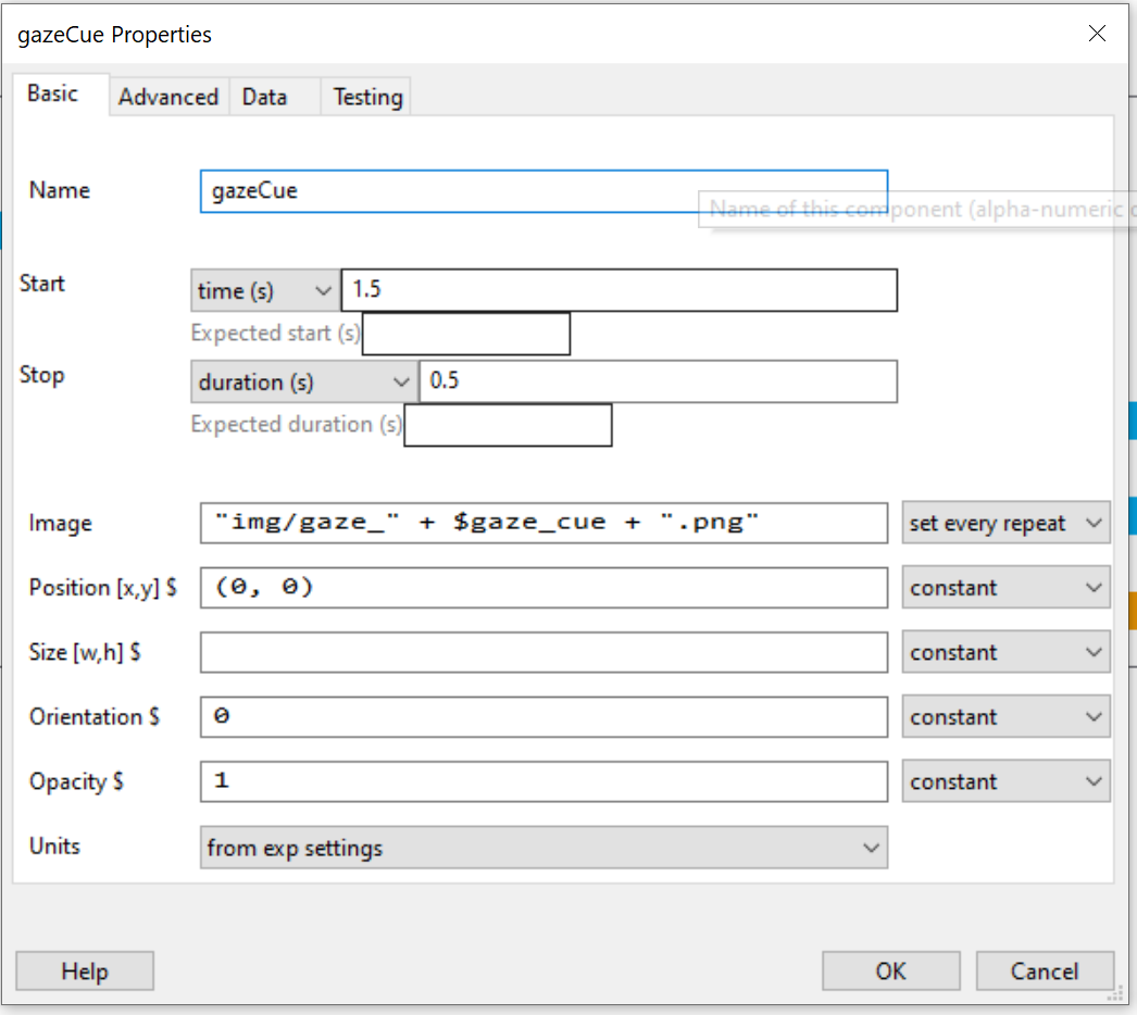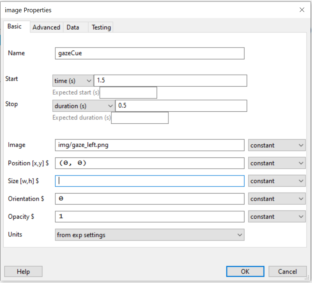 The Gaze Cue is next (i.e. what direction the eyes look). Now, in our experiment this will change trial by trial. However, for this first pass lets just hard-code it to look left (so we can see it displays correctly).