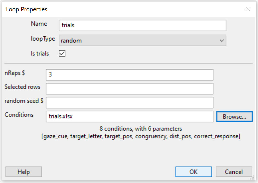 correct_response - This is key participants must press to be considered correct on a given trial. If you recall, they should press z if the letter is F, and m if the letter is H.PsychoPy is flexible with what you can use as a trials list. The easiest way for you to feed it a trials list though, is using an tabular formatted file such as an Excel workbook (.xlsx or .xls), or comma separated values file (.csv or .txt).