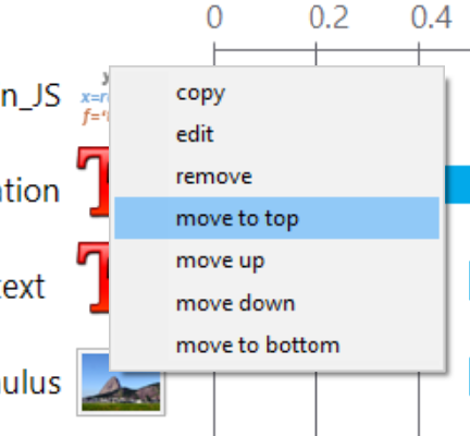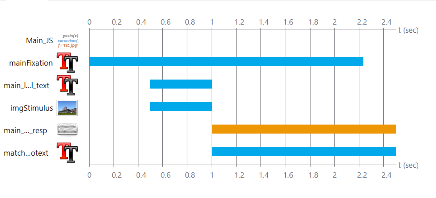 Like the Flow window, time is illustrated horizontally and looking at the Gannt-like chart, we see objects like ‘mainFixation’ start at 0, and end around 2.2 seconds, whereas others such as mainL…Ltext (truncated name) start getting displayed at around 0.5 seconds, and end at 1 second (i.e. they are presented for 0.5 seconds). Some objects like MainJS don’t have any time bar. This usually means they are presented all of the time.