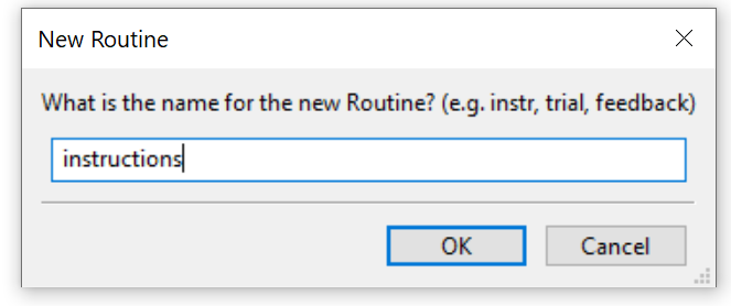 There is already a trial routine in the Flow, which we will leave for later. Lets create a new routine call ‘instructions’. click Insert Routine (left of the flow pane). A drop down menu will appear with either (new) or trial. We want (new) as per the image below.