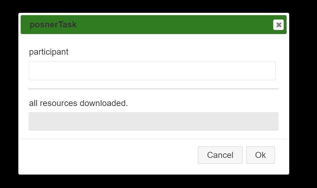 If all is well your experiment should start in a new browser tab. It will then download the necessary scripts onto your computer and wait for you to enter your participant code and click OK.