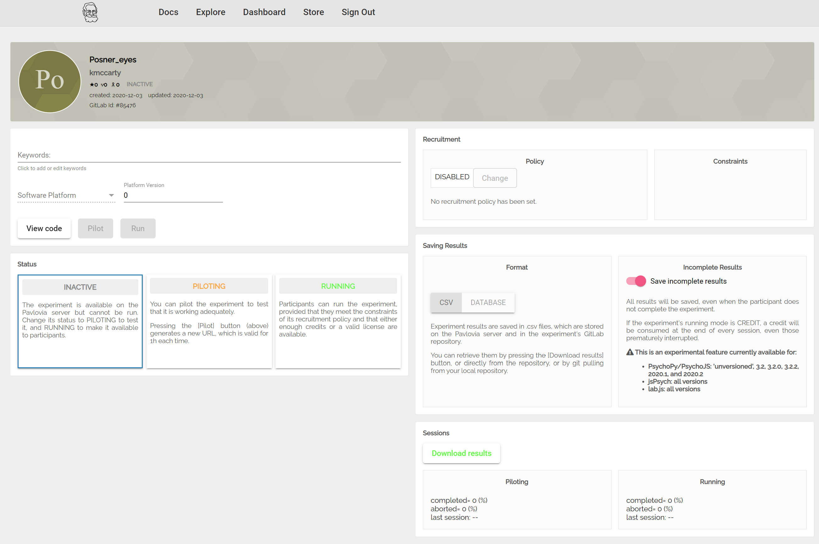 Experiments in this state are for testing to see they work and the data file downloads as soon as you are finished. To see if your experiment runs, we just need to click the Pilot button.