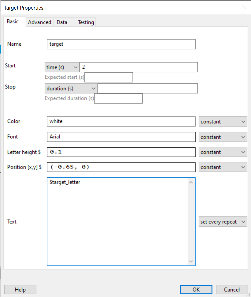 We want to change the color. I actually prefer black backgrounds, but this of course depends on the needs of your study. For example, a gray background might be good for eye tracking. You will see rather confusingly that the Color value is $[0,0,0]. you might be forgiven for thinking this refers to RGB values (0-255), but it actually ranges from -1, -1, -1 (white) to 1, 1, 1 (black). A quick hack is to simply type black.