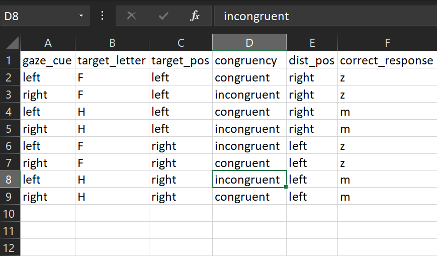 gaze_cue - this will form part of the filename that shows which direction our eyes will face. For example on row 1 gaze_cue is 'left', so when we apply this to the experiment it will form the 'left' portion of the filename 'gaze_left.png'